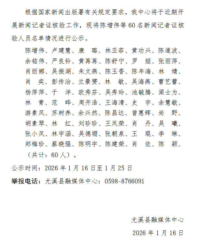 尤溪县融媒体中心关于2025年度新闻记者证核验人员情况的公示